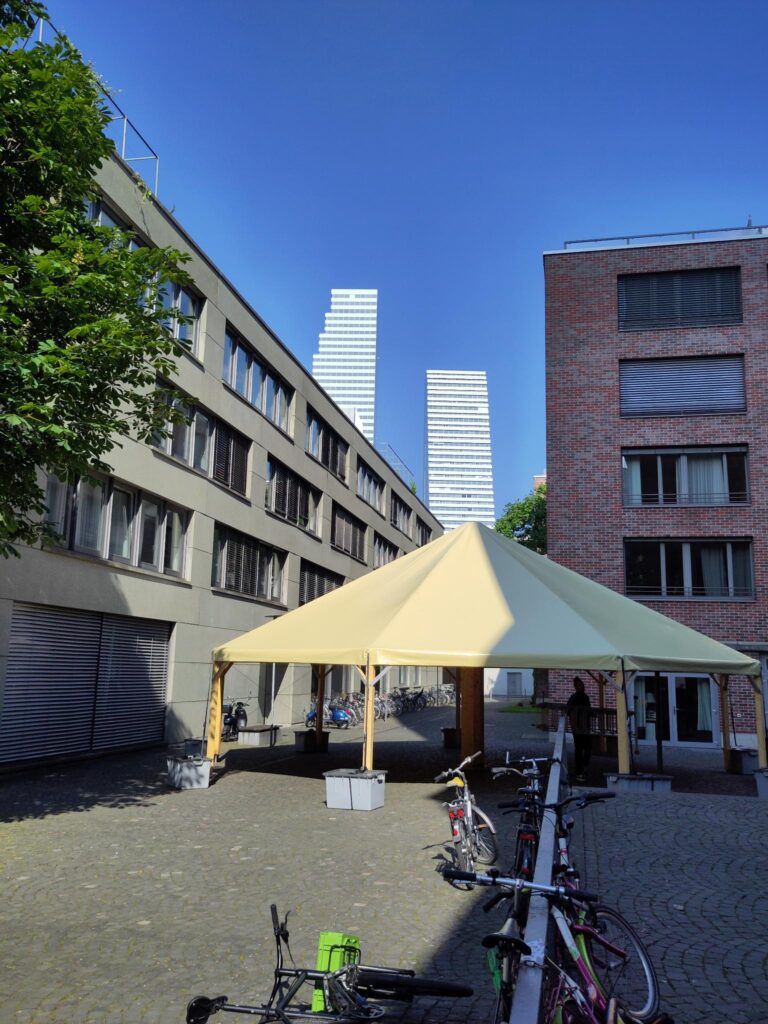 Da alle unsere Zelte, mit ausnahmen der Bühnen eine Bodenverankerung benötigen, wollten wir ein Zelt bauen, das als Gemeinschaftszelt, als Bar, als Essenszelt oder weiteres genutzt werden kann, ohne dass man dazu zwingend Erdnägel einsetzen muss. Das MZZ ist das Ergebnis davon.